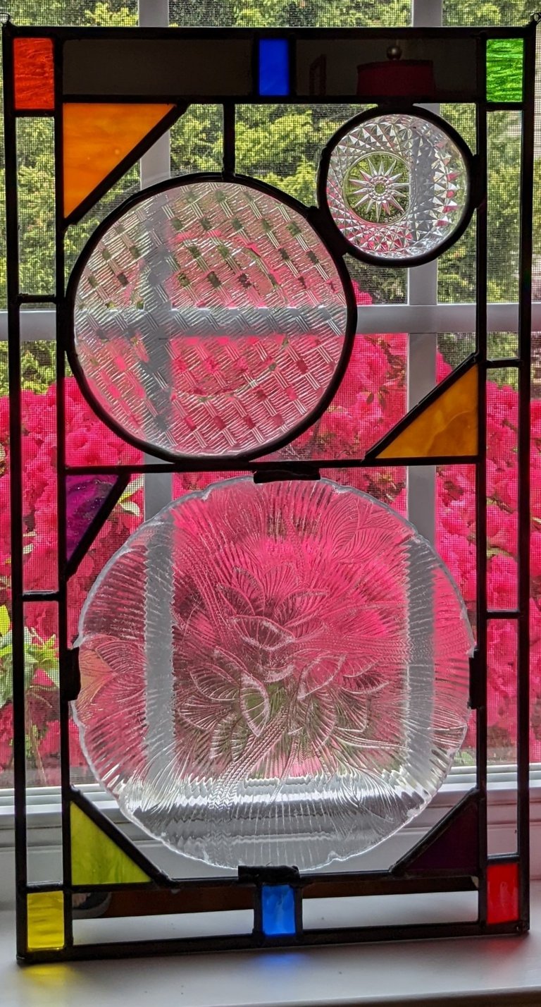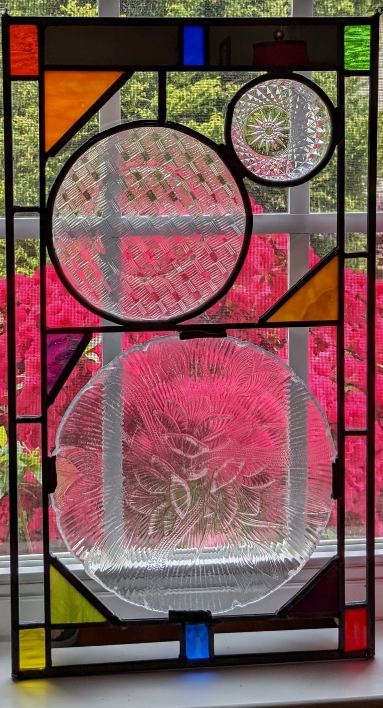 In addition to creating self-styled pieces for sale, Michael does custom commission work for home or office décor and for gifts. He specializes in abstract and mosaic designs. As a result of the Yadkinville show, Clemmons United Methodist Church commissioned him to create a 24” x 36” stained glass image of the UMC’s cross and flame symbol. The local church’s mission group hand-delivered this to the church they are helping to build in a village in Guatemala. It will be displayed in the front center window as the focal point of the new church’s entrance.