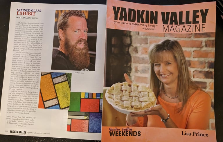 Michael has work on display in several triad area galleries. One of his pieces was awarded first place in a Second Spring show a few years ago. After he was recognized with the “People’s Choice” award in the Yadkin Cultural Center’s 2021 Juried Exhibition, he was invited to present a solo show there in the Welborn Gallery. Titled Let There Be Light, the exhibition ran in May and June of 2022 and featured 40 uniquely handcrafted pieces of stained glass art.